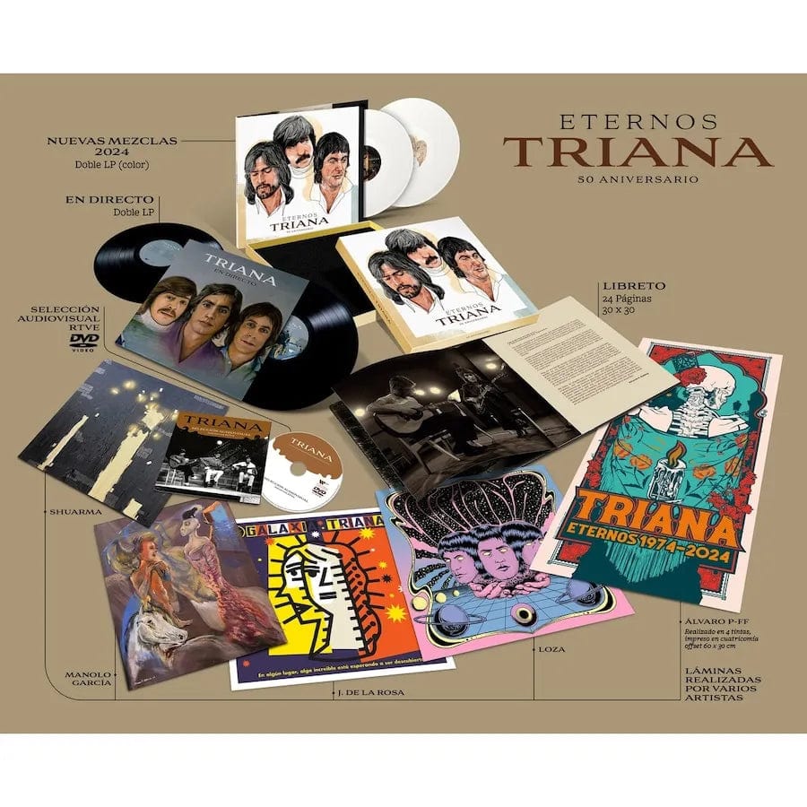 Y también, gracias a los archivos de RTVE, se edita un doble LP en directo, que contiene actuaciones grabadas en 1980 y 1975, en los estudios de RTVE, y que nunca habían visto la luz discograficamente hasta ahora. Para seguir descubriendo estos tesoros de los archivos de RTVE, se incluye también un DVD con una selección de sus mejores actuaciones o programas míticos como 'Popgrama', donde se ha restaurado la imagen consiguiendo una calidad destacable. Un libreto de 24 páginas ilustra su historia con cantidad de fotos inéditas cedidas especialmente por Máximo Moreno, y textos de periodistas y músicos que acompañaron a Triana en su carrera. También artistas como Shuarma de Elefantes, Manolo García, Loza (del grupo Calizo) o Javier de la Rosa de Milicia Gráfica, ofrecen su arte plasmado en 4 láminas de 30x30 cm con su visión de Triana en este aniversario. Y el poster diseñado por Álvaro Pérez Fajardo a 30x60cm completa el contenido de esta caja de lujo, que es una obra imprescindible.